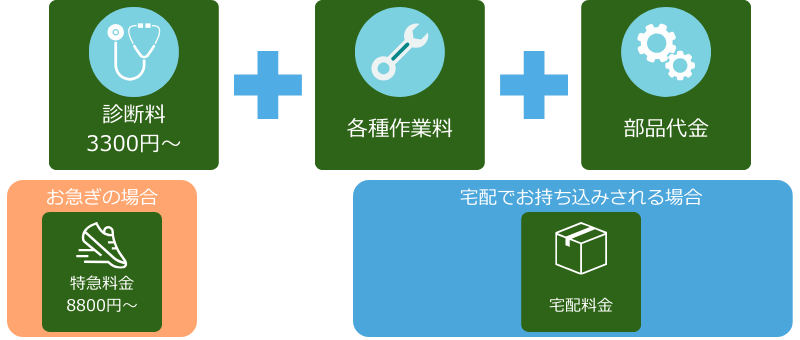 料金は基本的に、診断料、各種作業料、修理に部品の交換が必要な場合は部品代金も頂戴しております。